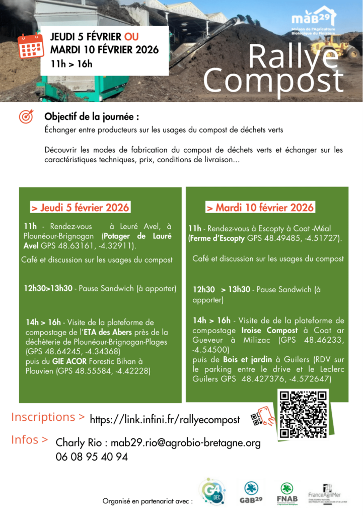 2 jours au choix, le 5 février (secteur Plounéour- Brignogan/ Plouvien) ou le 10 février (secteur Milizac/ Guilers). Inscriptions préférable ici : https://link.infini.fr/rallyecompost