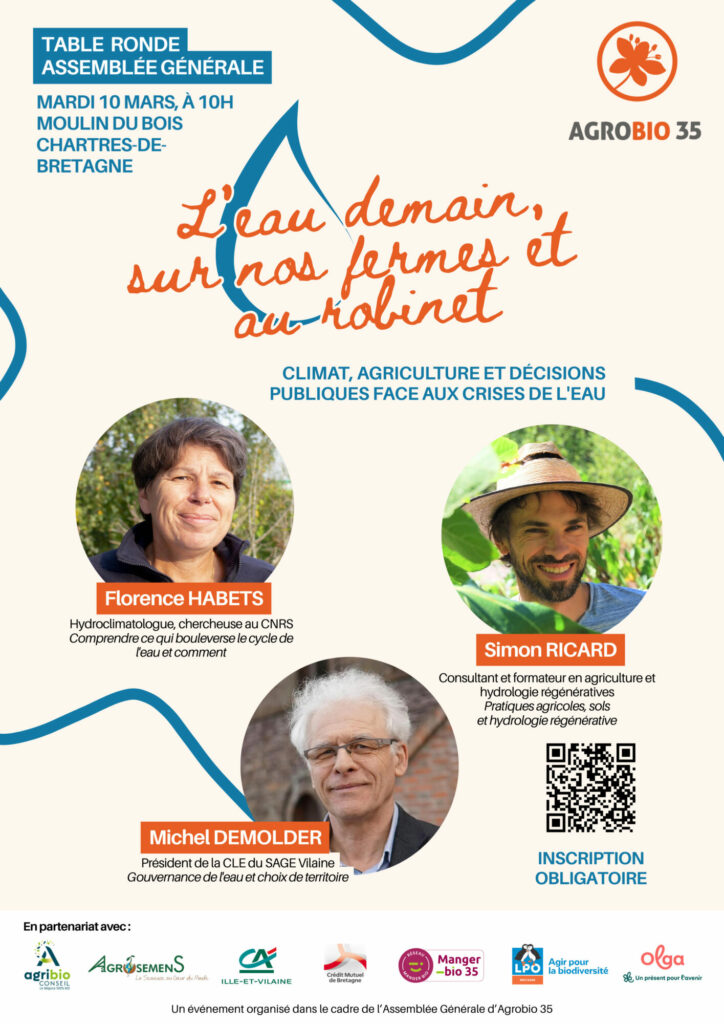 Dans le cadre de son Assemblée Générale, Agrobio 35 propose une table ronde ouverte à toutes et tous pour croiser les regards, partager les leviers d’action et imaginer ensemble l’eau de demain — sur nos fermes et à nos robinets.