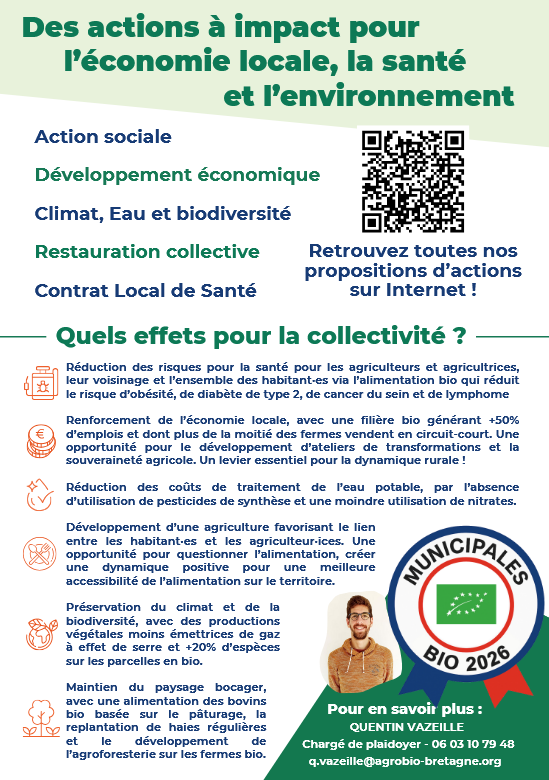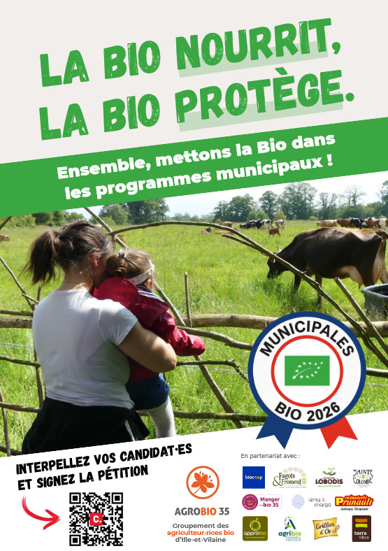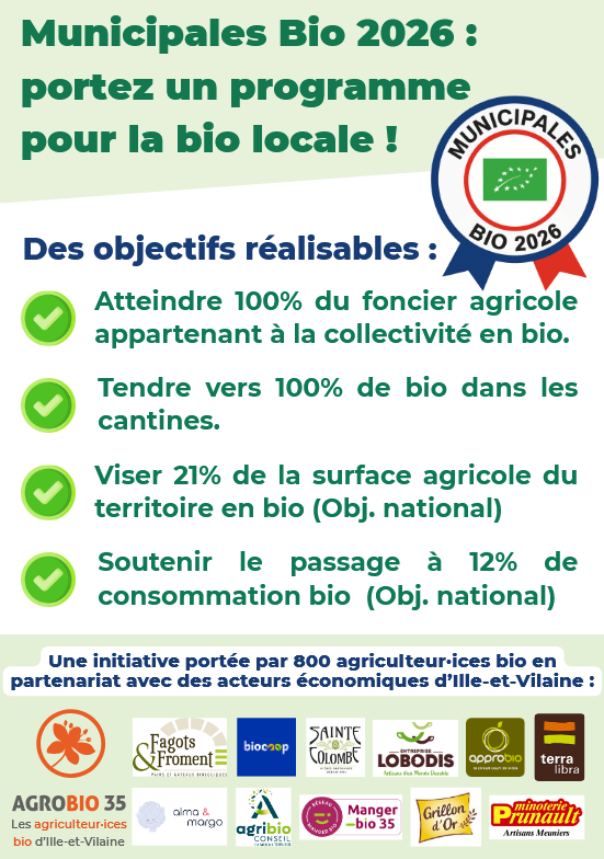 Je vous invite également à identifier les engagements pris par d’autres listes autour de notre commune sur ce sujet et à mettre des objectifs/actions en faveur de la bio dans votre programme, grâce aux éléments disponibles sur le site dédié : www.agrobio-bretagne.org/ille-et-vilaine-municipales-bio-2026/