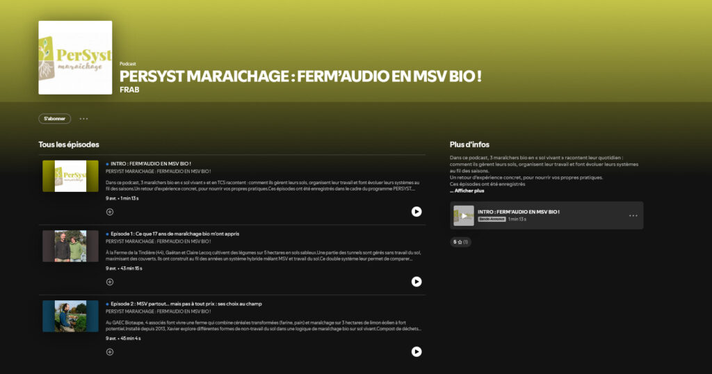 Ces épisodes ont été enregistrés dans le cadre du programme PERSYST. Persyst est un programme de recherche Ecophyto (2019–2024) dédié à la fertilité des sols et à la pénibilité du travail en maraîchage bio.