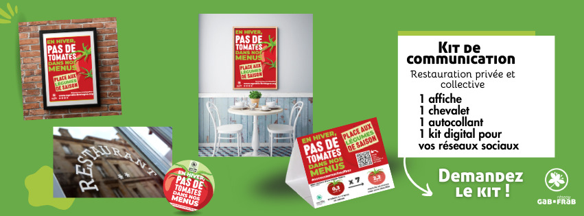 Alors qu’une tomate produite en hiver sous serre chauffée consomme jusqu’à sept fois plus d’énergie qu’une tomate de saison, le réseau des Agriculteurs Bio de Bretagne (GAB-FRAB) lance une nouvelle campagne pour défendre la saisonnalité. Destiné aux restaurateurs, ce kit de communication gratuit leur permet d’afficher clairement leur engagement « En hiver, pas de tomates dans nos menus ».
